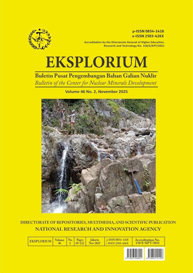 EKSPLORIUM - Buletin Pusat Pengembangan Bahan Galian Nuklir is a journal published by the National Research and Innovation Agency (BRIN) and has been accredited with a SINTA 2 rating based on the decree of the Ministry of Education, Culture, Research, and Technology number 158/E/KPT/2021 dated 9 December 2021 concerning Ranking of Scientific Journal Accreditation Period I Year 2021. Manuscripts published in this journal are the results of studies, research, and development of nuclear geology with the scope: exploration, geology, mining, processing of nuclear minerals, occupational safety and the environment and the development of nuclear technology for the welfare of society.