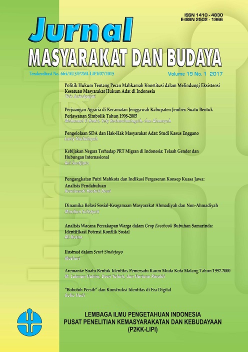 Samarinda, the capital city of East Kalimantan province are inhabited by various ethnic groups. Friction between residents and groups are frequent. Small conflict between residents involving different ethnic groups may widen into conflict of ethnic, religion, race, and inter group relationship called SARA. This study aims to identify potential conflicts with SARA nuances in Samarinda city through citizens’ conversation discourse in Facebook group called ‘Bubuhan Samarinda’ (FBS). Identification of conversation was analyzed through FBS group. The FBS discourse represents the issue within Samarinda citizens. On the contrary, the opinion within FBS group influences citizens’ life. This paper used critical discourse analysis from Fairclough. The data were gathered from the discourse conversation among FBS group members. The result shows that the conversations tend to use primordial statement dominated by ethnic factor. The primordialism sounds like propaganda of one ethnic group. There are the provocations of conflict between indigenous and the migrants, that shows social jealousy. There is also a stigma that immigrants only exploit the wealth of Borneo, which becomes a main problem in Samarinda. The potential violence arises from the existence of ethnic organization. Samarinda adalah ibu kota Provinsi Kalimantan Timur yang dihuni oleh beragam suku. Gesekan-gesekan antarwarga dan kelompok sering terjadi. Konflik kecil antarwarga melibatkan kesukuan dapat melebar ke konflik SARA. Penelitian ini bertujuan untuk mengidentifikasi potensi konflik bernuansa SARA di Kota Samarinda melalui wacana percakapan warga dalam grup Facebook ‘Bubuhan Samarinda’ (FBS). Identifikasi percakapan warga melalui grup FBS.Wacana yang terbentuk dalam FBS merepresentasikan isu yang berkembang dalam kehidupan warga Kota Samarinda. Begitu pula sebaliknya, opini yang terbentuk dalam grup FBS mempengaruhi kehidupan warga. Penelitian ini menggunakan analisis wacana kritis Model Fairclough.Data penelitian diambil dari wacana percakapan anggota grup FBS. Teknik analisis data menggunakan model interaktif. Hasil penelitian menunjukkan bahwa adanya potensi konflik bernuansa SARA yang didominasi faktor kesukuan. Hal itu didukung oleh tingginya primordialisme warga. Munculnya propaganda bahwa suku tertentu harus disegani. Adanya provokasi antara suku asli dengan pendatang yang lebih banyak dipicu kecemburuan sosial. Terbentuknya stigma bahwa pendatang menjadi biang masalah di Kota Samarinda karena hanya mengeksploitasi kekayaan Kalimantan. Potensi kekerasan menguat karena keberadaan organisasi massa yang mendasarkan pada kesukuan.